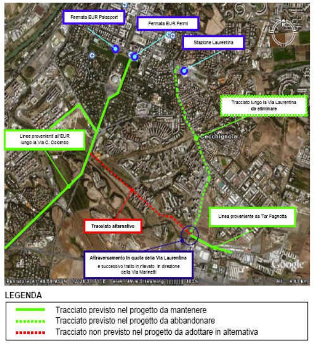 6) Il Progetto prevede che quasi tutte le linee giungano all’EUR confluendo sulla direttrice della Via C. Colombo, tranne quella proveniente da Tor Pagnotta, che giunge alla stazione Laurentina.